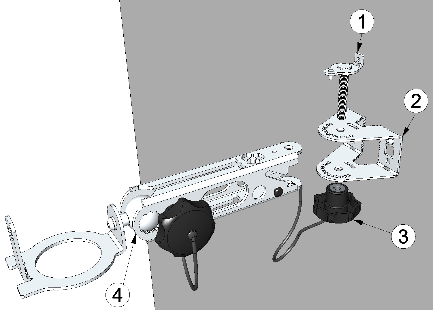 1 Coach bolt fitted with a lock pin in the bolt head 3 Star knob 2 Flange for wall mounting 4 Swivel arm - Insert the BLE Radar in the sensor recess of the swivel arm and align it correctly. Detailed instructions on this are provided in chapter Flexibly adjustable mounts.