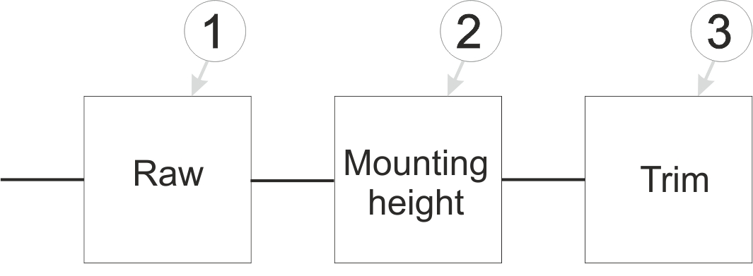 | 1 | Generation of the raw value, which is the distance to the water surface (see Determining the raw value (distance) ) | 3 | adds the configurable value for "trimming" to the preliminary water level (see Taking trimming into account) |