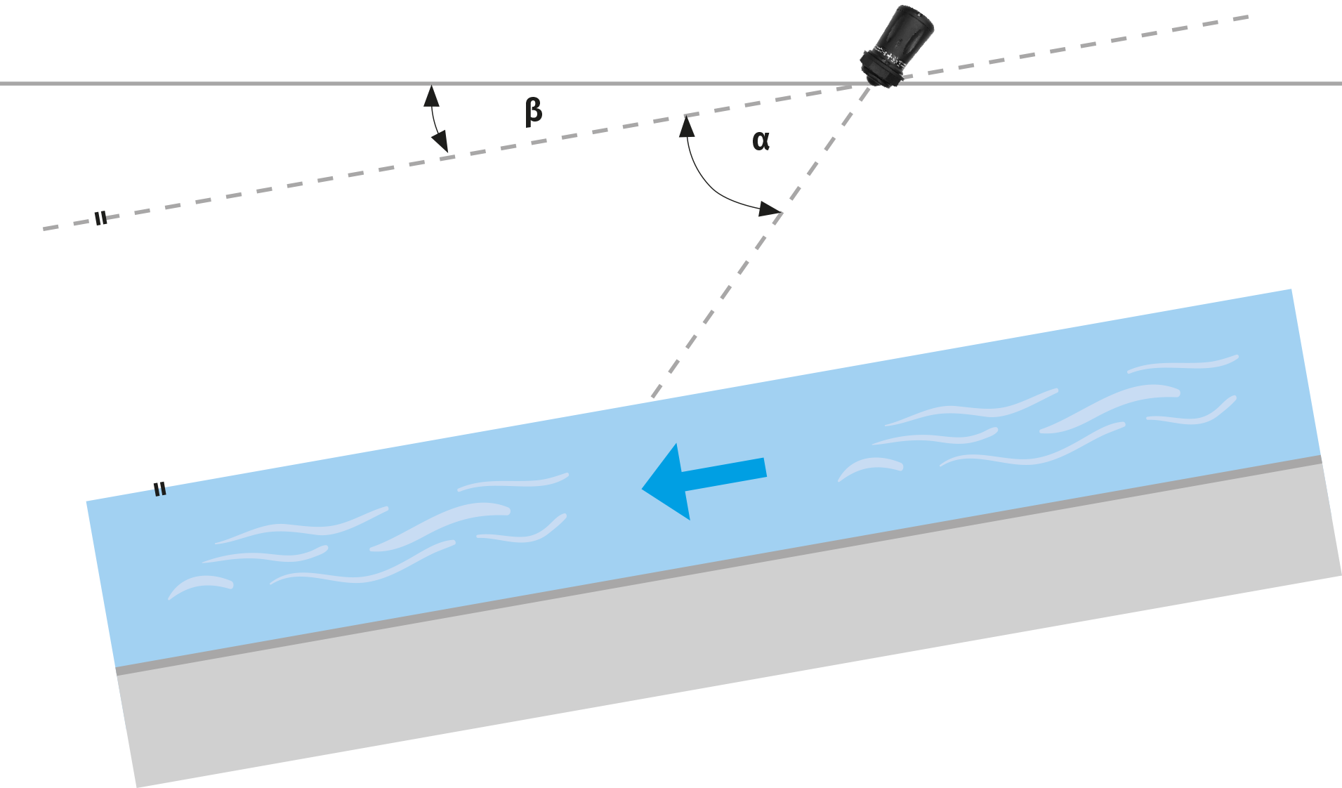 If the channel has a gradient of ≥ 2° , this must be taken into account when determining the angle of attack of the sensor. When installing upstream, the angle between the sensor axis and the horizon must be reduced by the angle of the gradient. When installing downstream, the angle between the sensor axis and the horizon must be increased by the angle of the gradient. This correction ensures that the angle of attack of the sensor relative to the water surface corresponds to the desired angle (e.g. the recommended 45°).